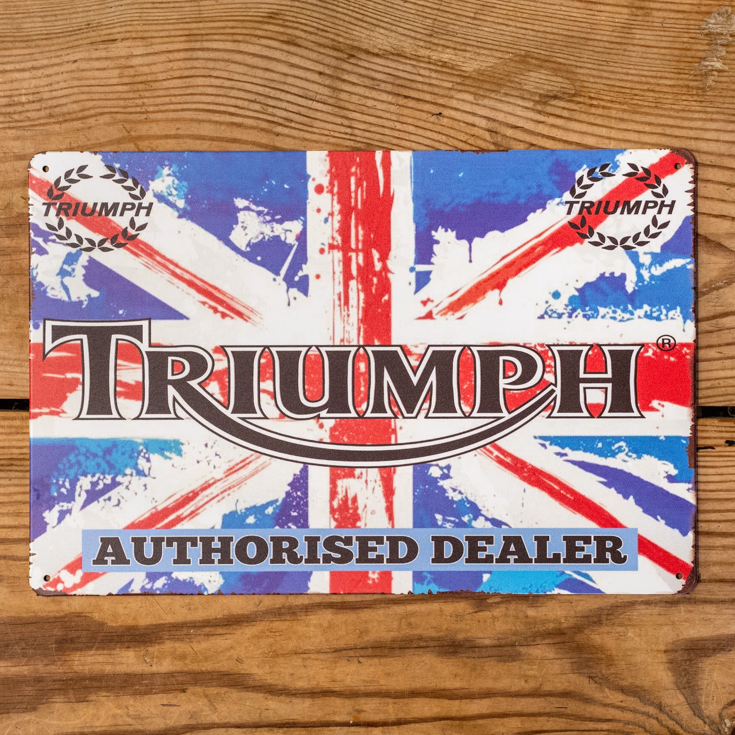 Rev up your space with this iconic Triumph Union Jack metal sign. Perfect for the British motorcycle enthusiast, this vintage-style piece celebrates the legendary marque with bold patriotic flair. Whether you're decorating a garage, man cave, or showroom, it's a statement piece that speaks to timeless engineering and classic British cool. Durable metal construction ensures it'll turn heads for years to come.